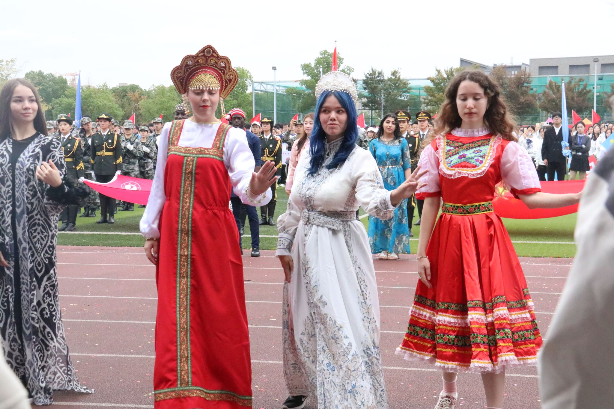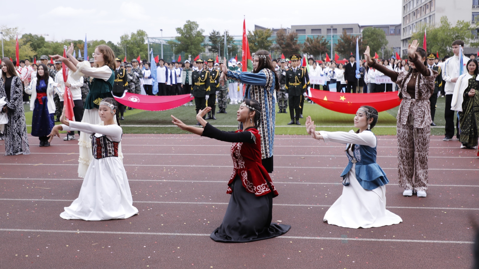 开幕式上,来自21个国家的80名国际学生组成了国际教育学院方阵。他们身着各具特色的国别传统服饰,以灵动轻快的舞姿点燃全场,赢得了观众的热烈掌声,一场精彩的“服装快闪”展现了多元文化的魅力。国际学生们手持国旗,精神饱满、步伐整齐,高呼“我爱中国,我爱嘉大;Faster,Higher,Stronger,Together!”的口号,展现出昂扬向上的精神面貌。