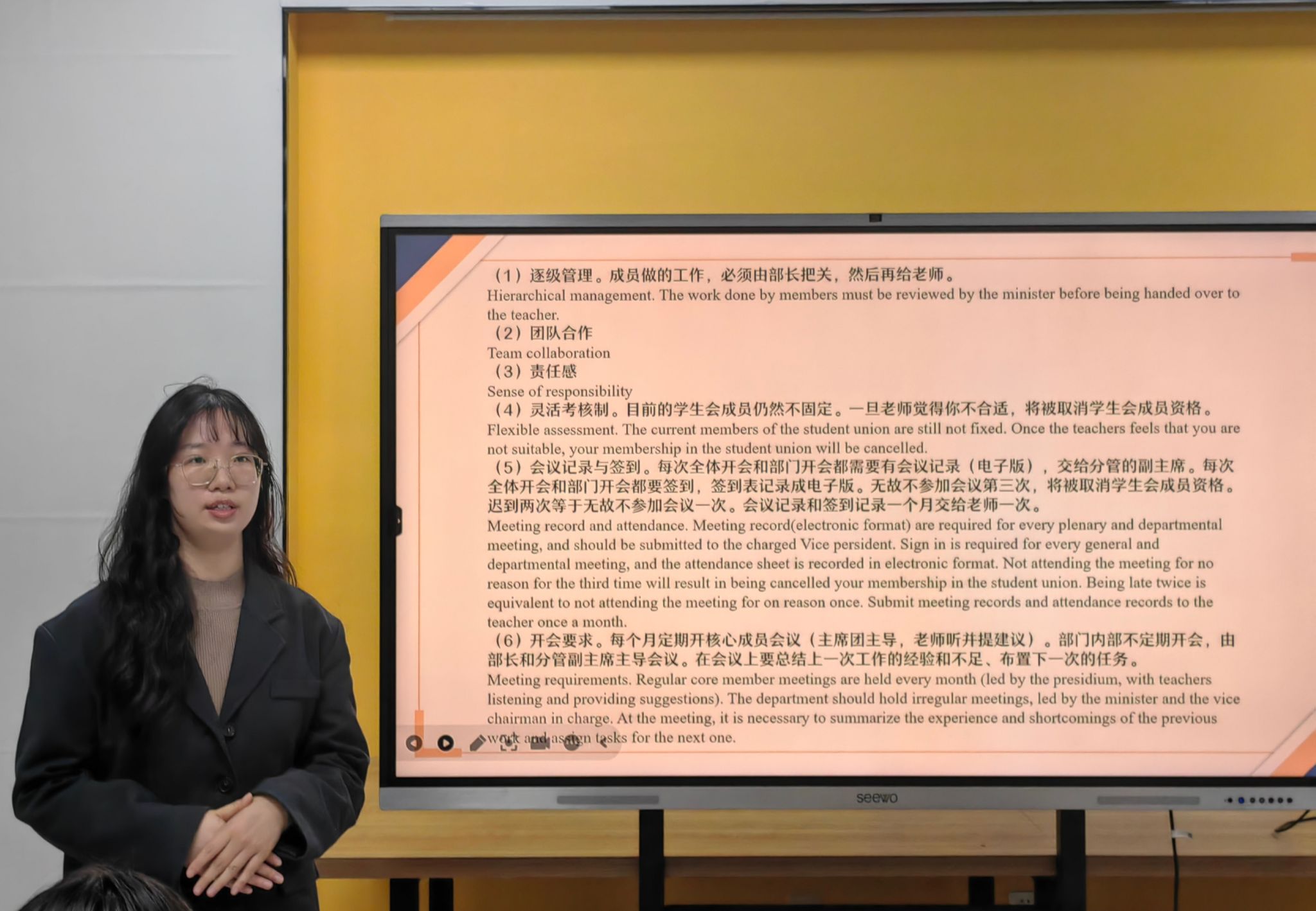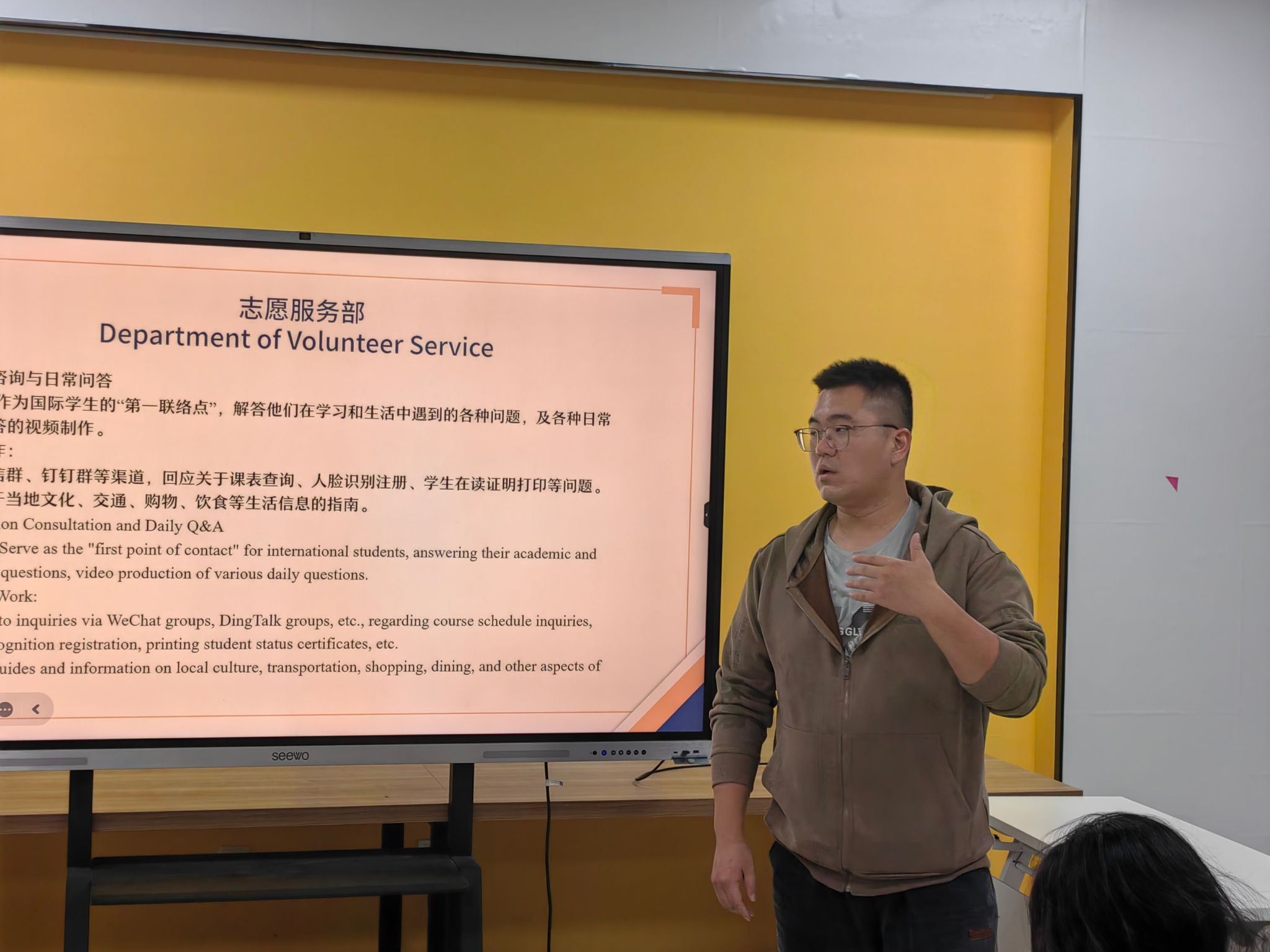 李游老师对新一届学生会工作提出殷切期望。她指出,学生会是锤炼能力、增长才干的重要平台,希望全体成员珍惜机会、履职尽责,以饱满的热情和务实的作风投入学习与工作,切实发挥自身作用与价值。王雨露老师与王炜东老师随后就学生会的整体架构进行了系统介绍,并对各部门工作作出具体部署,强调全体成员应端正工作态度,以奉献精神服务集体,展现国际学生的良好风貌。