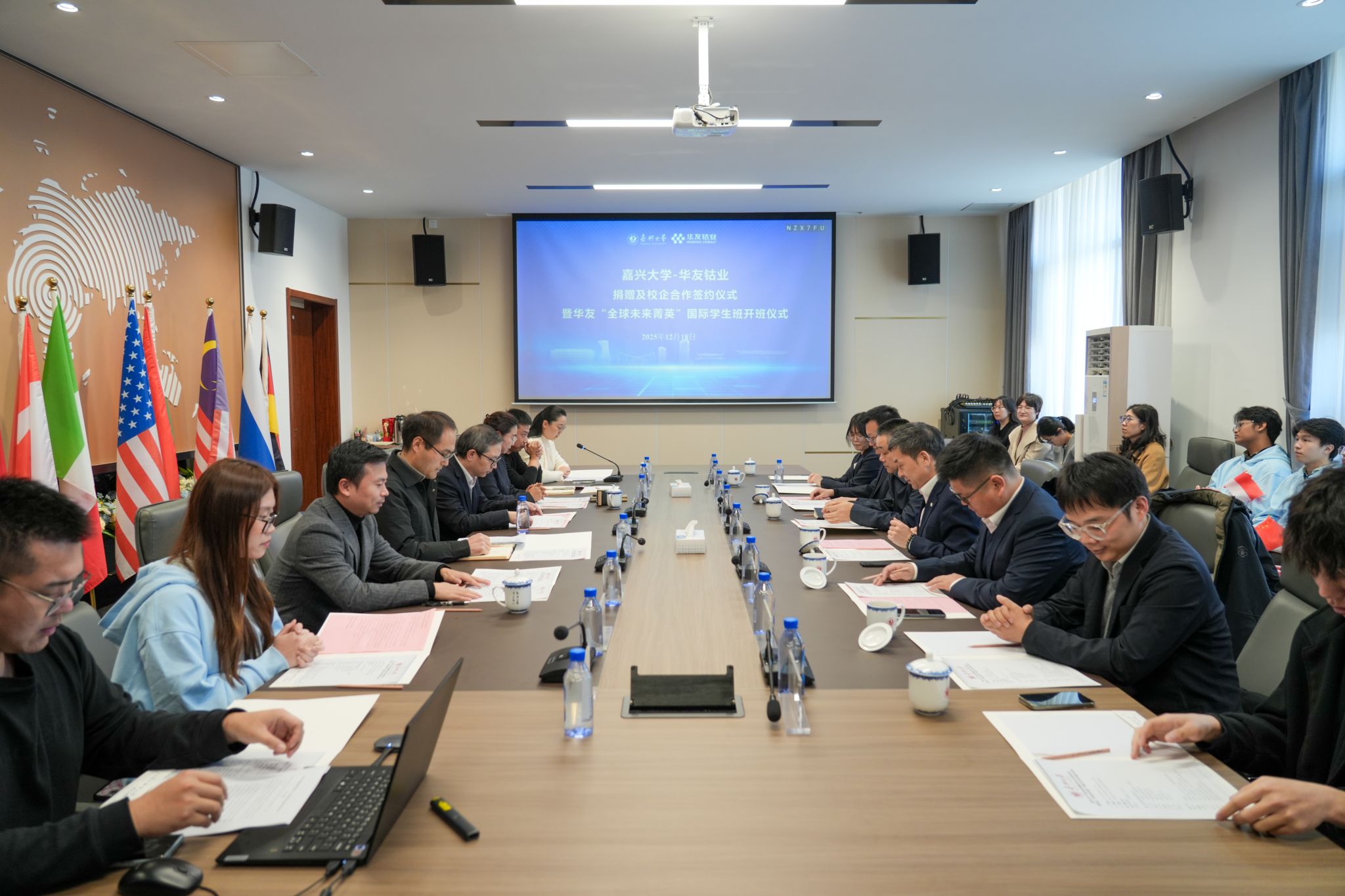 2025年12月16日,嘉兴大学梁林校区厚德楼406会议室高朋满座、气氛热烈。嘉兴大学与浙江华友钴业股份有限公司捐赠、校企合作签约暨“全球未来菁英”国际学生班开班仪式在此隆重举行。嘉兴市商务局党委委员、副局长黄根松,嘉兴大学副校长周宏伟、国际教育学院院长潘巍巍,华友钴业集团人力资源管理中心总经理李谦等校企双方代表及首批18名印尼国际学生共同见证了这一重要时刻。仪式由嘉兴大学国际教育学院副院长刘韵超主持。