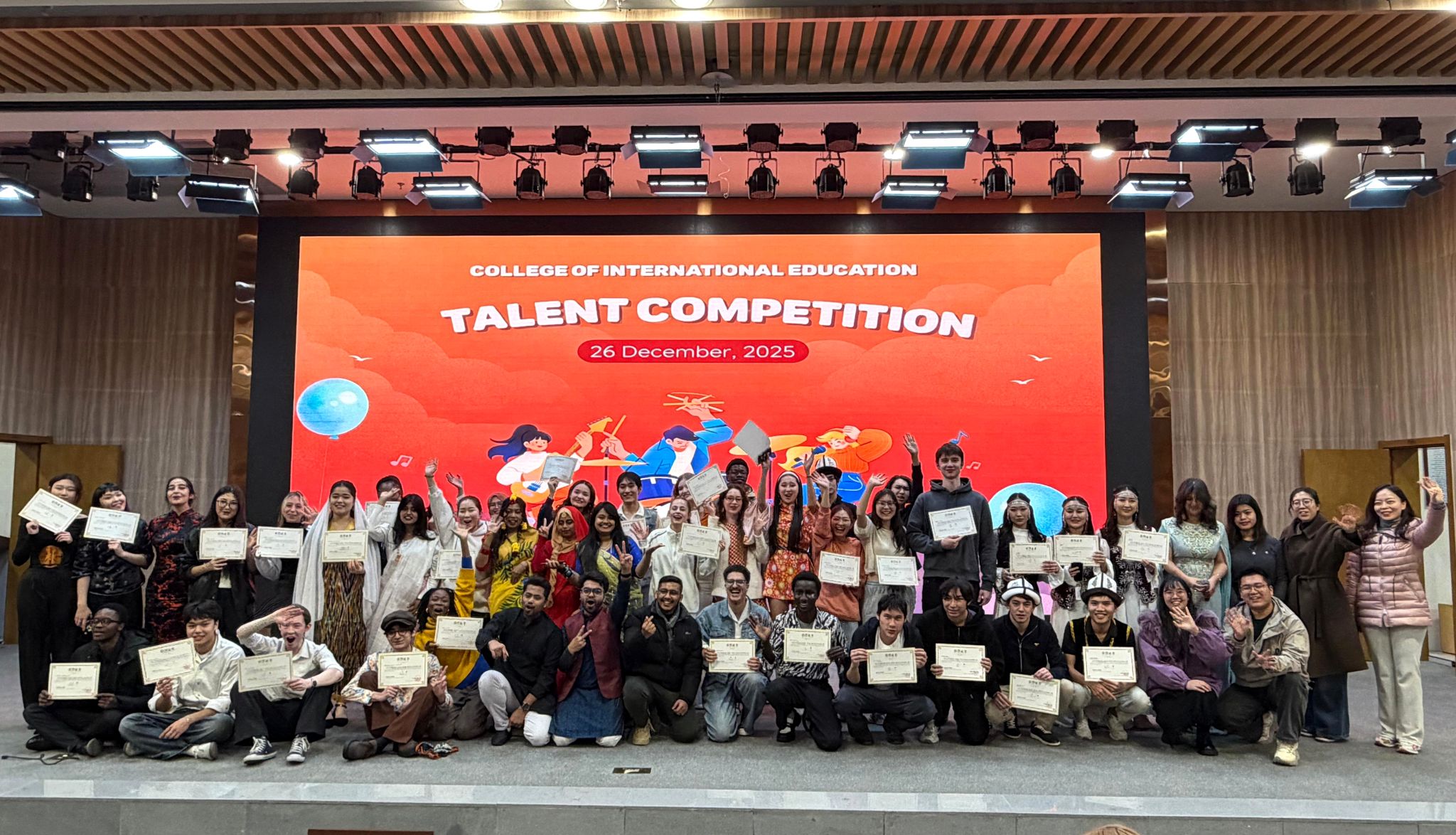 2025年12月26日,由国际学生会文体部举办的“艺彩无界,共绘未来”第一届国际学生才艺比赛圆满落下帷幕。本次比赛吸引了50余名国际学生踊跃参与,共17组选手登上舞台,他们用歌声、舞步与创意,呈现了一场青春洋溢、文化交融的视听盛宴。