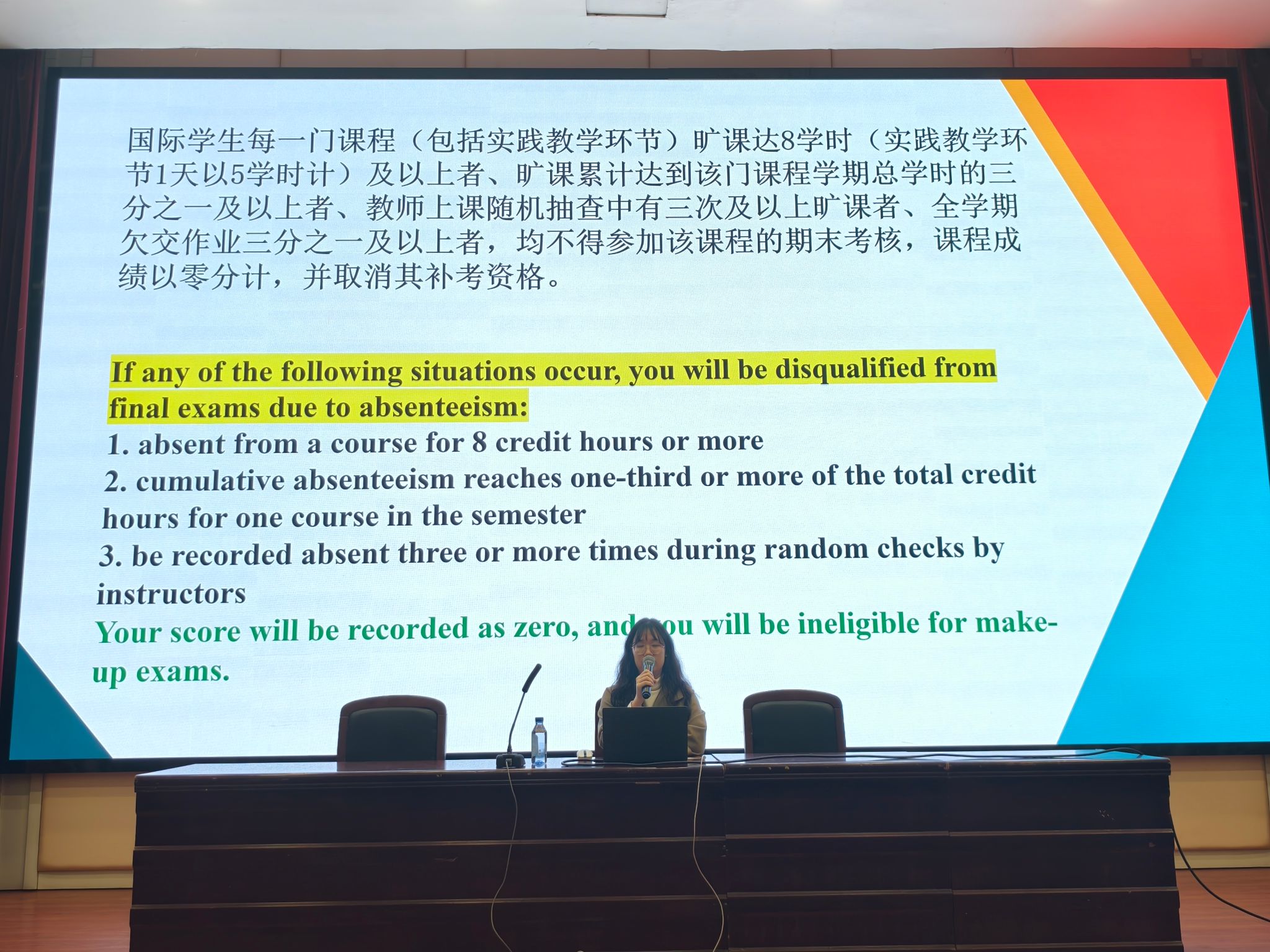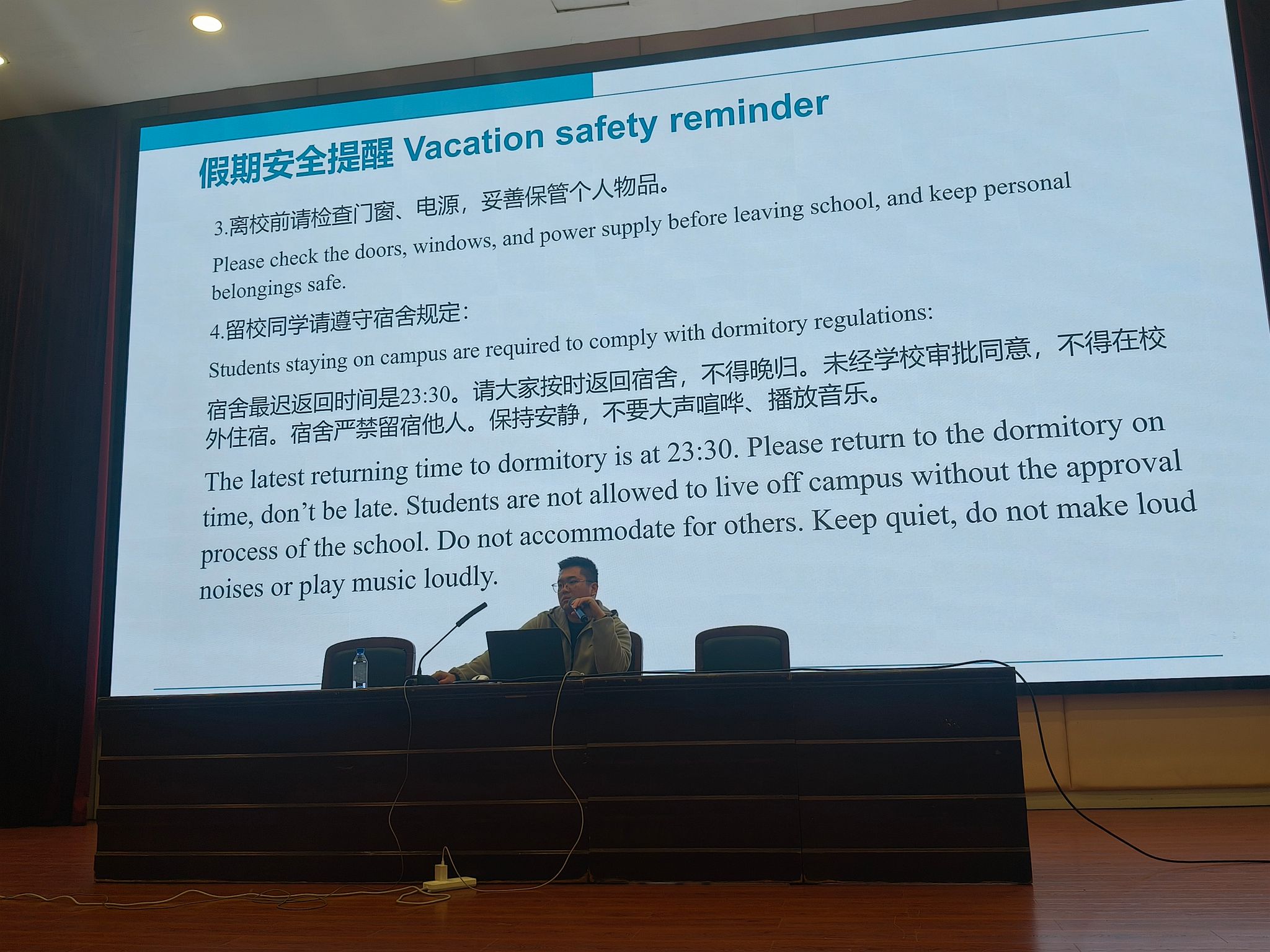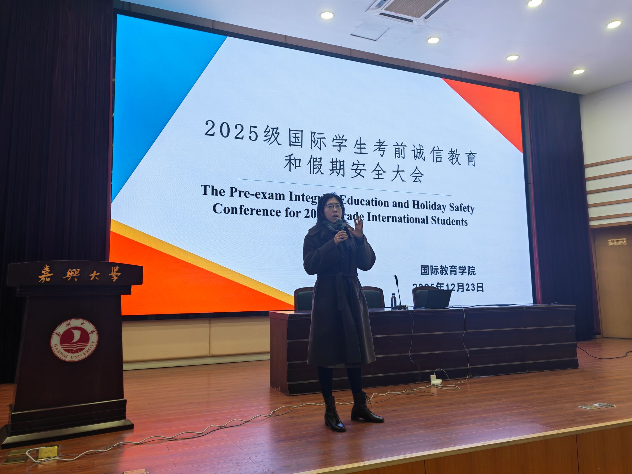 2025年12月23日,国际教育学院在TCL报告厅面向2025级国际学生开展了专项教育讲座。讲座旨在帮助学生更好地适应校园生活、树立学术诚信观念并提升安全意识,内容围绕心理健康调适、考试纪律规范与假期安全防护三大主题展开。