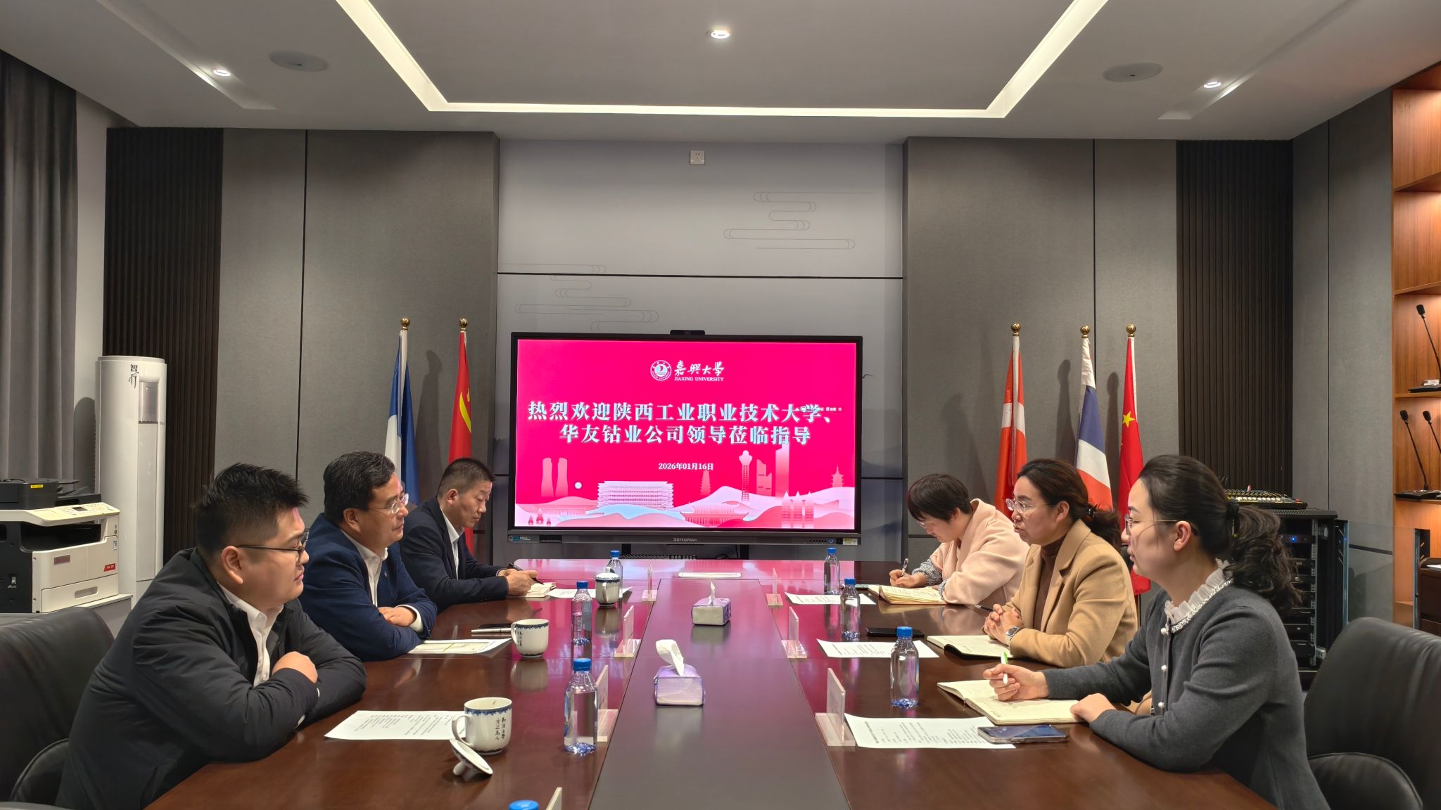 1月16日下午,陕西工业职业技术大学、浙江华友钴业股份有限公司代表一行来访我院,围绕国际学生校企合作工作展开深入调研与交流。陕西工业职业技术大学国际教育学院院长秦景俊、化工与纺织服装学院总支部书记杨修国,浙江华友钴业股份有限公司人力资源管理中心管理学院副院长黄超、人才发展主管吴珊珊,嘉兴大学国际教育学院院长潘巍巍、国际教育学院副院长刘韵超、综合办公室主管游雪参加座谈会。本次座谈聚焦三方校企协同育人机制建设经验交流,旨在推动两校国际化人才培养模式创新,进一步提升校企合作实效。