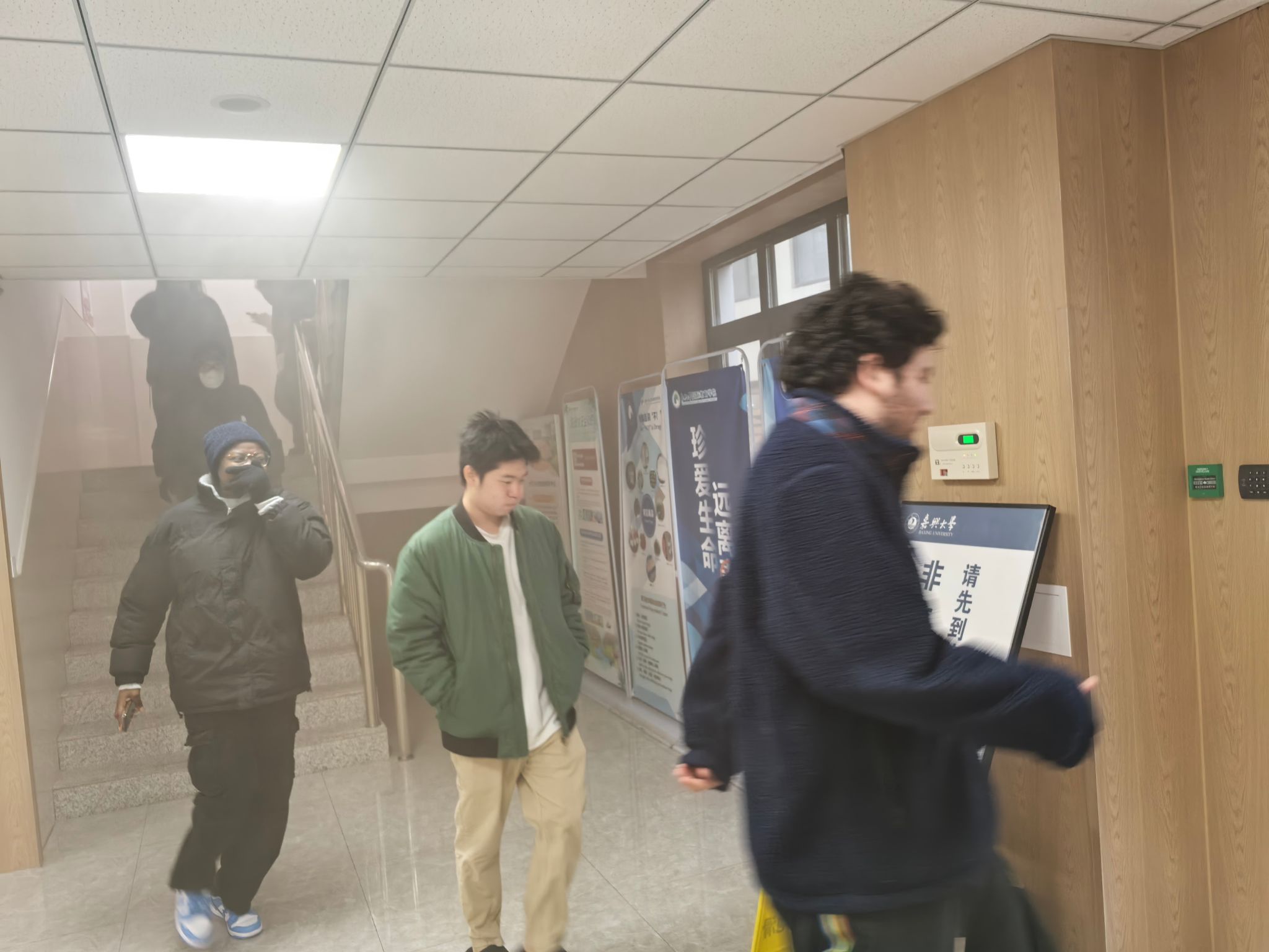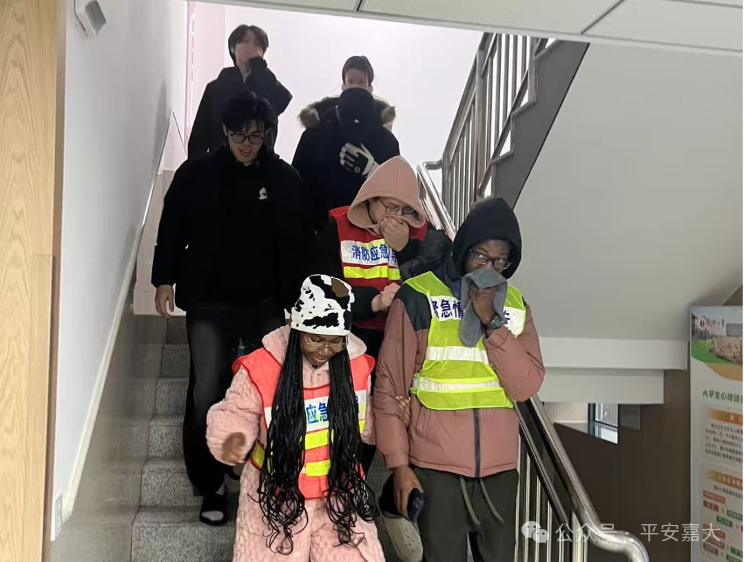 进入应急逃生演练环节,学院不仅提前周密部署,确保各岗位人员到位,更是充分发挥留学生骨干力量,由国际学生会成员担任各楼层疏散引导员,使用中英双语进行现场指引。在学院老师的统一指挥和引导员的提醒下,留学生们严格遵守“低姿弯腰、捂好口鼻、不乘电梯、有序撤离”的要求,迅速安全地通过模拟烟雾区域,撤离至指定集合点。随后,学院老师立即高效清点人数,确保每一位留学生安全无误。
