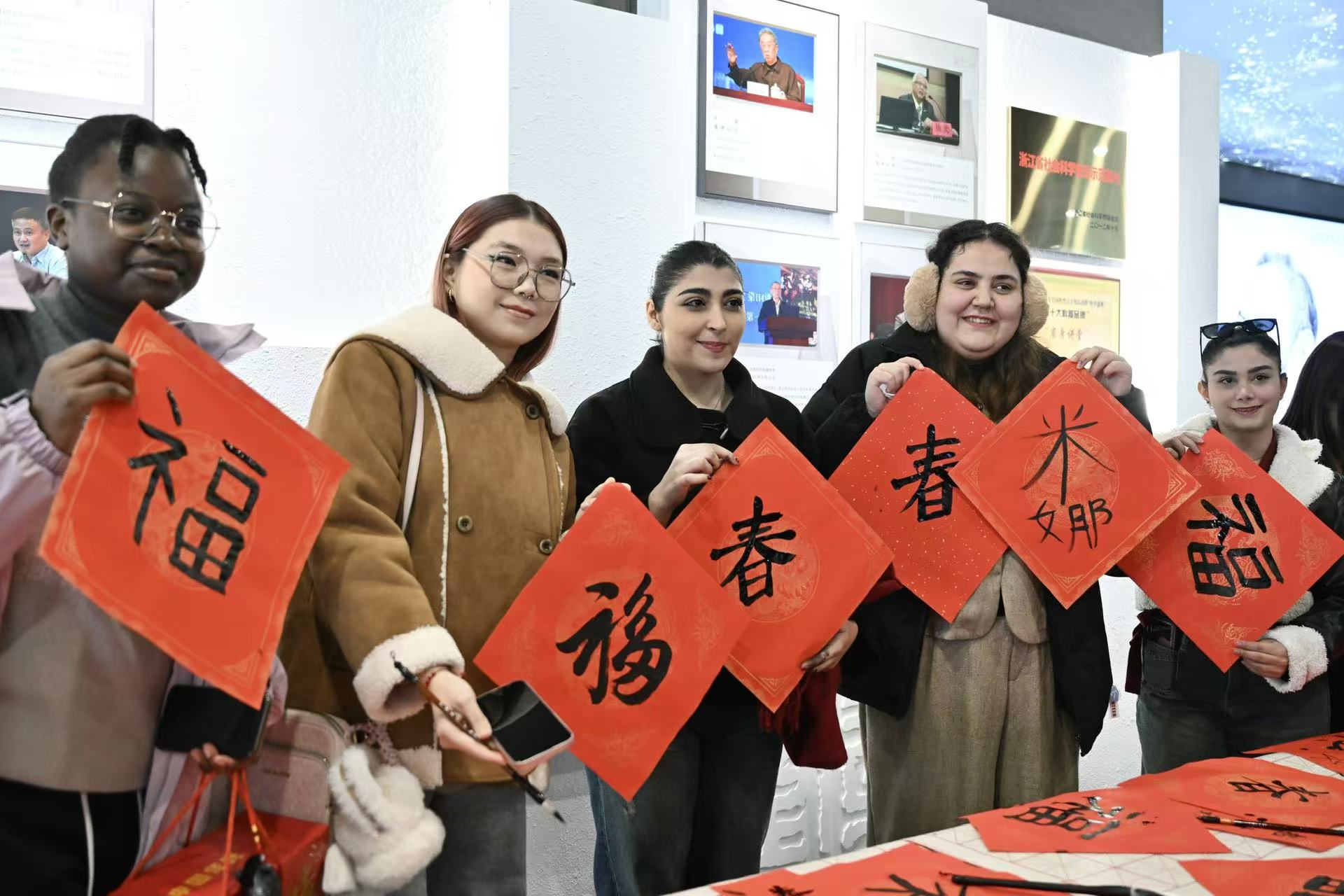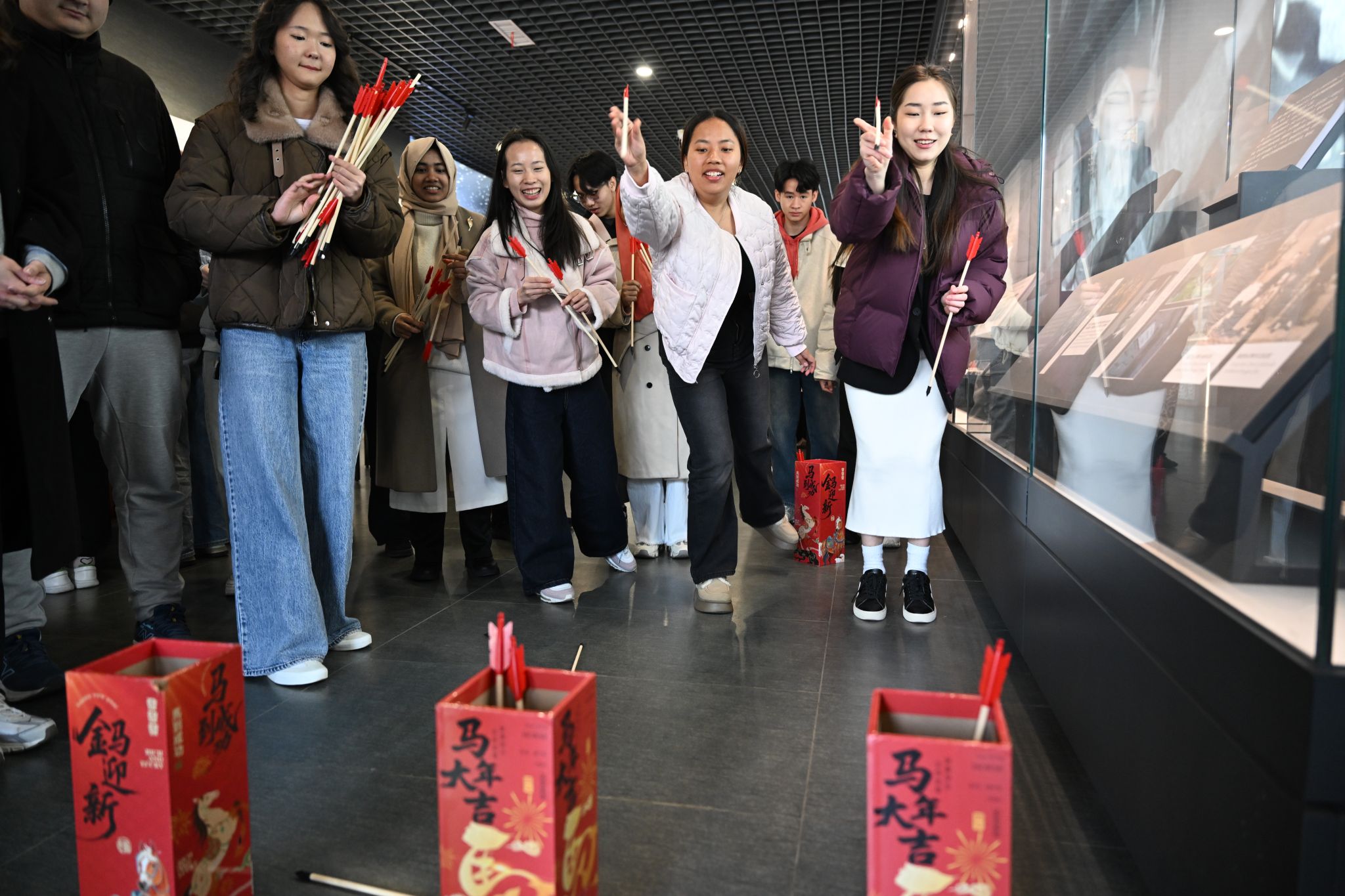 会后,为让国际学生们更直观地体验中国传统新春习俗,学院在图书馆报告厅门外设置了写福字、写春联以及投壶等互动体验环节。在老师和学生志愿者的指导下,国际学生兴致勃勃地参与其中,亲身体验中华传统文化的独特魅力。