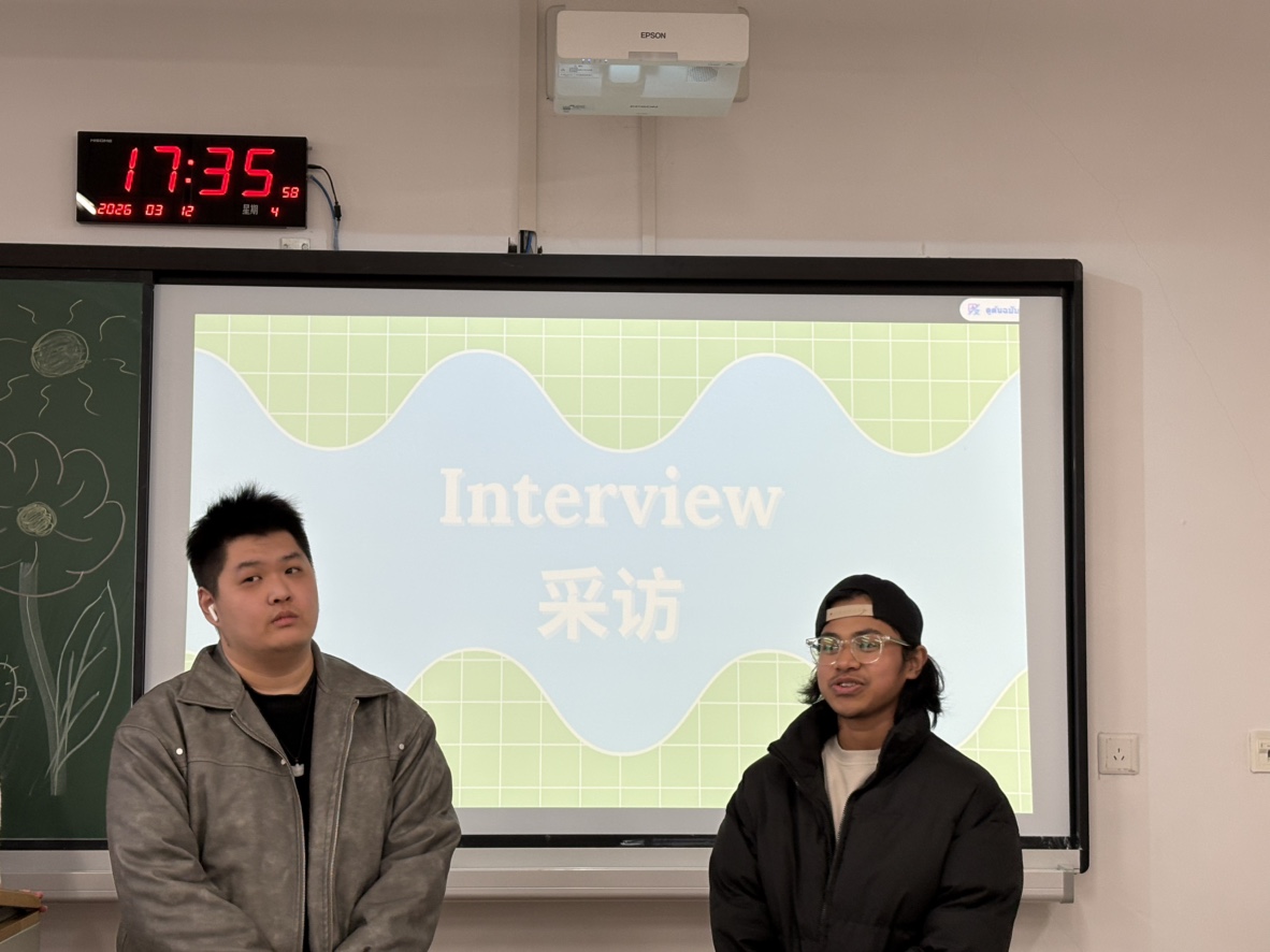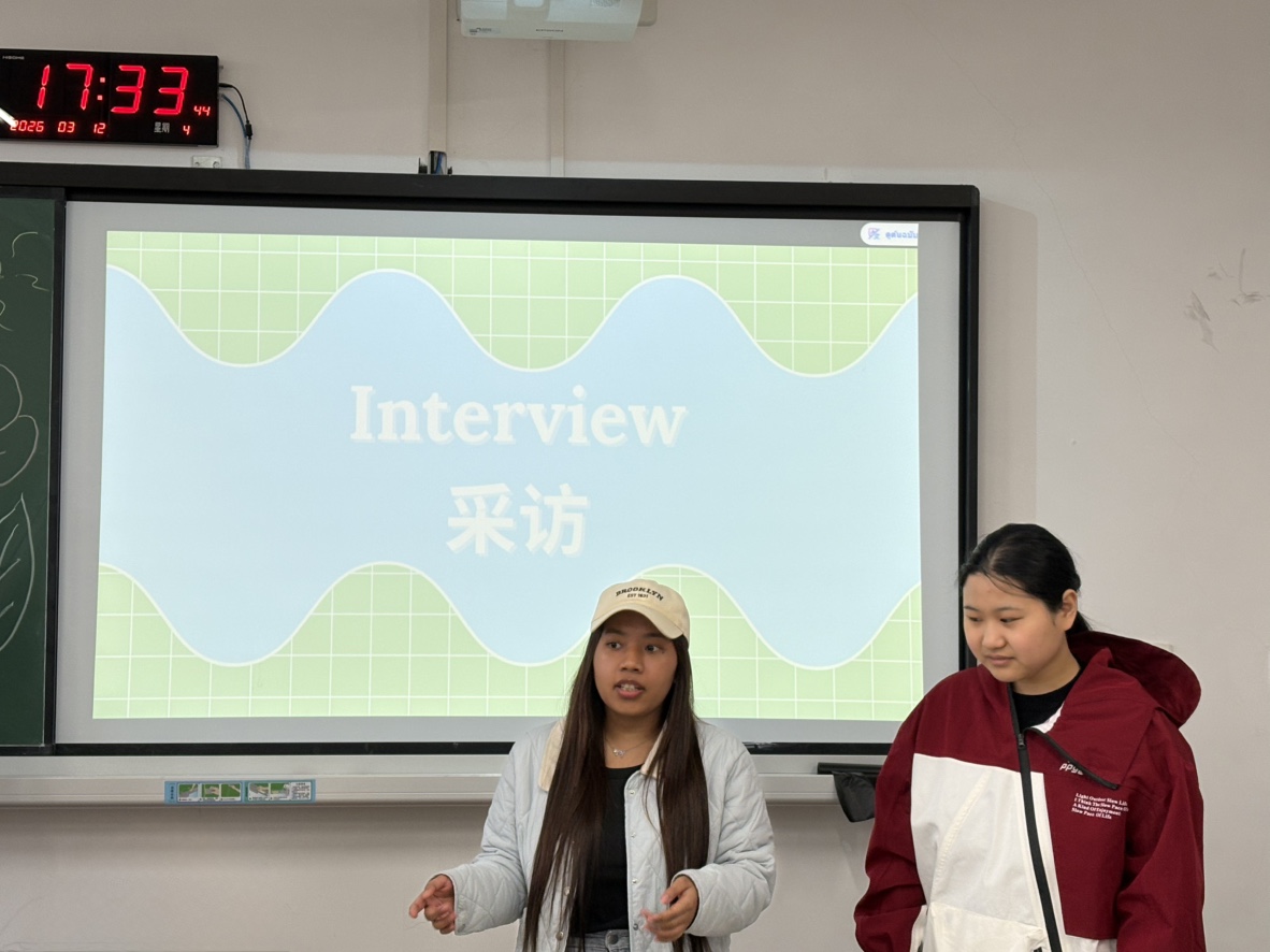 小组讨论后,学生们走出教室,在校园内开展实地采访。大家用中文随机采访一至两名中国学生,围绕环境保护话题展开简短交流。这一环节不仅锻炼了学生们的汉语听说能力,也让他们从更多角度了解不同人群的环保观念。采访结束后,大家回到教室进行成果分享,用中文总结讨论内容与采访收获,清晰的表达和独到的见解赢得阵阵掌声。