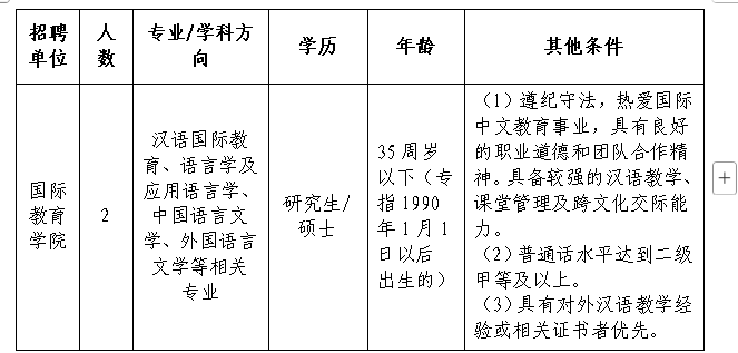 本次计划拟面向社会公开招聘对外汉语教师(人才派遣),招聘人数及具体岗位相关条件详见下表。